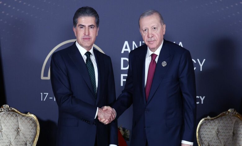 Cumhurbaşkanı Recep Tayyip Erdoğan, Antalya Diplomasi Forumu (ADF2026) kapsamında Irak Kürt Bölgesel Yönetimi (IKBY) Başkanı Neçirvan Barzani ile bir araya geldi. Görüşmede bölgesel çatışmalar, petrol arz güvenliği ve Kalkınma Yolu Projesi ele alındı.